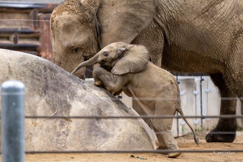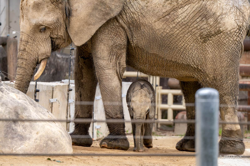 お待ちかね、マルミミゾウの親子と対面です。マルミミゾウ親子の公開時間は13:30〜14:30までの1時間*。平日にも関わらず、多くの人が集まっていましたが、特に混乱することもなく、みんな静かに観覧されていました。
