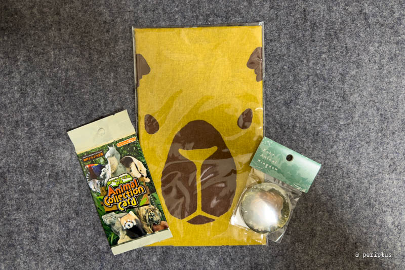 動物園や水族館に行くと、ついつい買っちゃうお土産。どうぶつ王国はかわいいデザインのグッズが豊富なのが罪なところ。今回はあまり荷物を増やしたくなかったので、厳選して手ぬぐいとバッヂとトレーディングカードを購入しました。