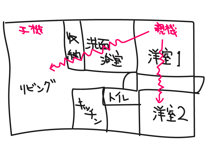 我が家は2LDKのマンション。ネットの回線は洋室1の壁から引き込みWi-Fiルーター親機から家中に電波を飛ばしている状態です。リビングに設置したWi-Fiルーターは子機として電波を受信し、有線でテレビやゲーム機に接続しています。
