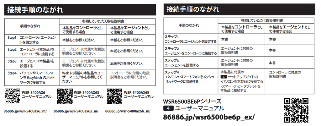 上記の画像は、左がWSR-5400AX6、右がWSR6500BE6Pの「Wi-Fi EasyMeshでの接続手順(PDF)」の抜粋です。これ良くできていて、どちらの取扱説明書を見れば良いのかが、一目でわかるようになっています。体裁が統一されているのも良いですね。このありがたさを味わえるのも同一メーカー縛りのおかげと言えましょう。