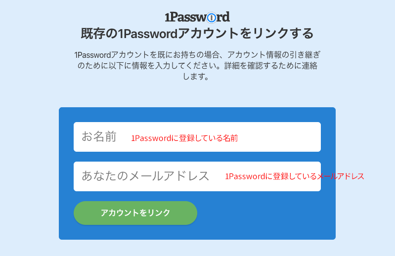 表示された画面で「1Passwordに登録している名前」と「1Passwordに登録しているメールアドレス」を入力