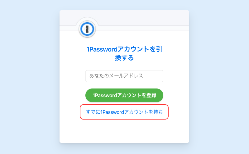 1Password.com配下に遷移し、「すでに1Passwordアカウントを持ち」をクリック