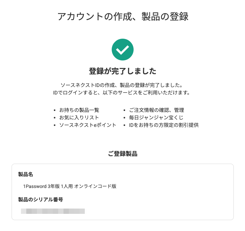 SourceNextで購入したコードを1Passwordアカウントにリンクしました。3年間のサブスクリプションが今すぐ有効になりました。